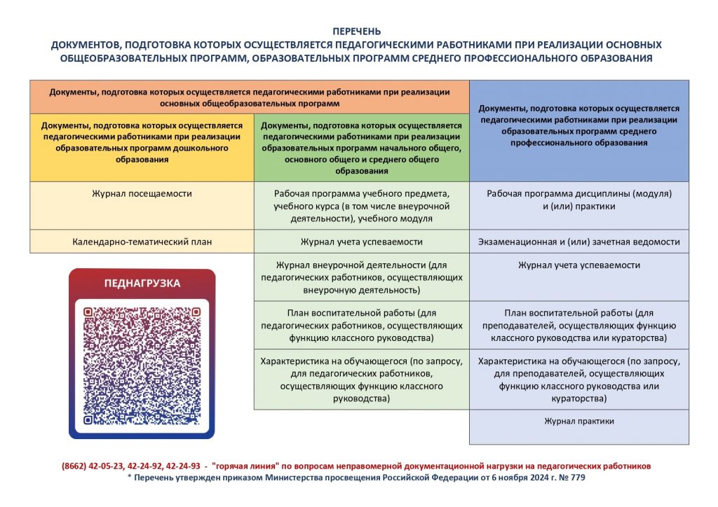 Поручение о снижении бюрократической нагрузки на учителей дано Правительством Российской Федерации в 2022 году. Ведомством, ответственным за координацию работы в данном направлении и контроль, определена Федеральная служба по надзору в сфере образования и науки (Рособрнадзор). С 1 сентября 2022 года начал действовать перечень документации, подготовка которой осуществляется педагогическими работниками при реализации основных общеобразовательных программ (приказ Минпросвещения России от 21.07.2022 № 582). С 1 марта 2025 года действует приказ Минпросвещения России от 06.11.2024 № 779 «Об утверждении перечня документов, подготовка которых осуществляется педагогическими работниками при реализации основных общеобразовательных программ, образовательных программ среднего профессионального образования».